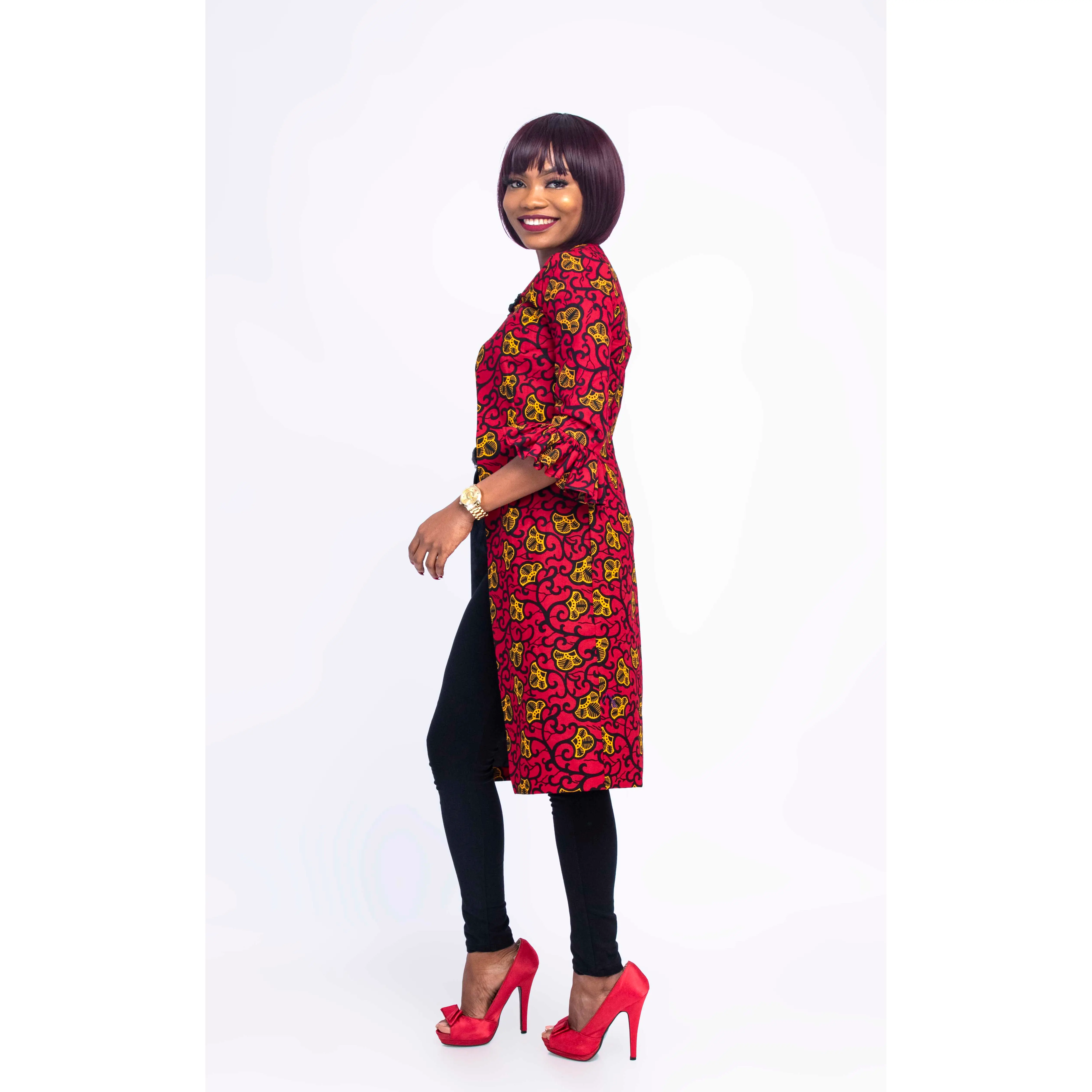 This African print coat and crop top saves you the headache of a camisole. It can be worn for every occasion. It’s trendy and stylish with a lovely sleeve and button at top center front. You can pair with a pant, leggings or pencil dress. Ify African coat dress let your look speak classy.