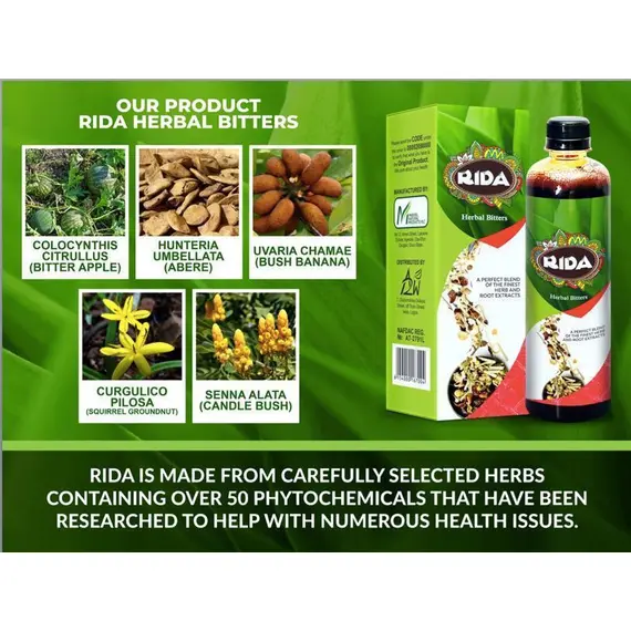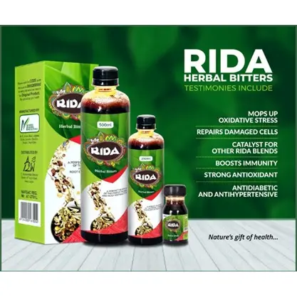 RIDA is proudly made in Nigeria with herbs that are exclusively of western origin and have been proven to help with  general well being as well as helping to manage many  body ailments with testimonies ranging from diabetes, high blood pressure, high cholesterol, obesity, weak erection, low libido, infertility, etc.