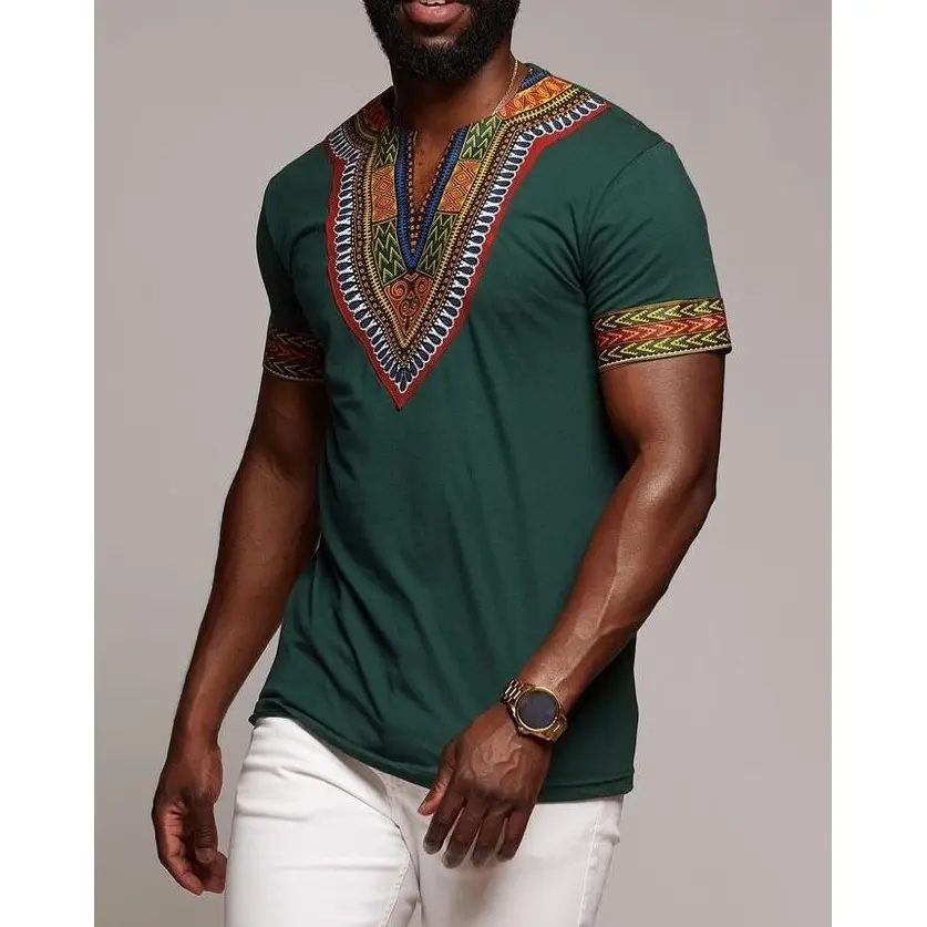Modern Green V-Neck T-Shirt with Maasai Print – Stylish Fitted Casual Tee for Men & Women