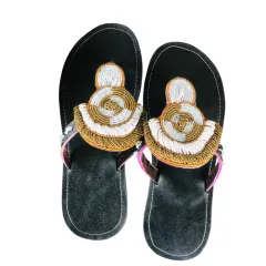 Women's open shoes are traditional handmade footwear crafted by the Rwandan people of East Africa, often using durable leather and recycled materials like old tires for the soles. They are decorated with colorful beadwork and patterns.